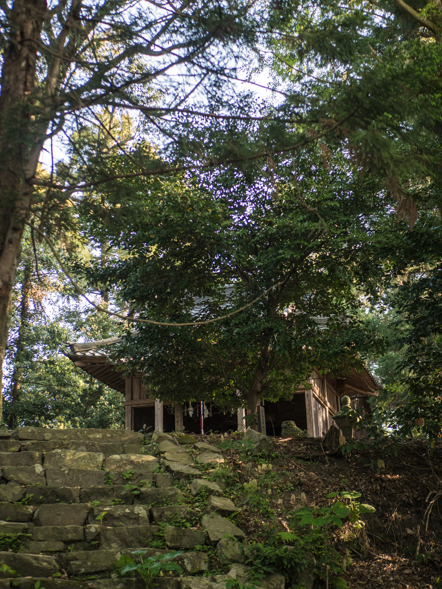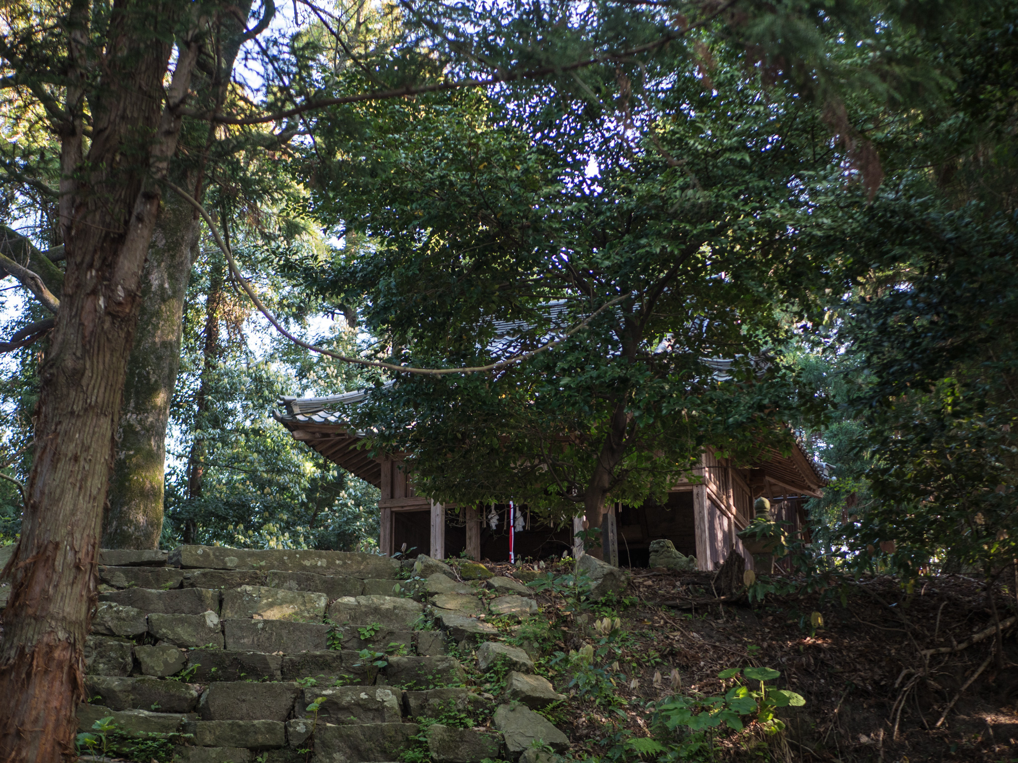 廣大山普門院を右手に見て果樹園を進むと下宮が鎮座しています。下宮の社殿左脇の小径から柿畑を右手後方に登ると登山道に入ります。